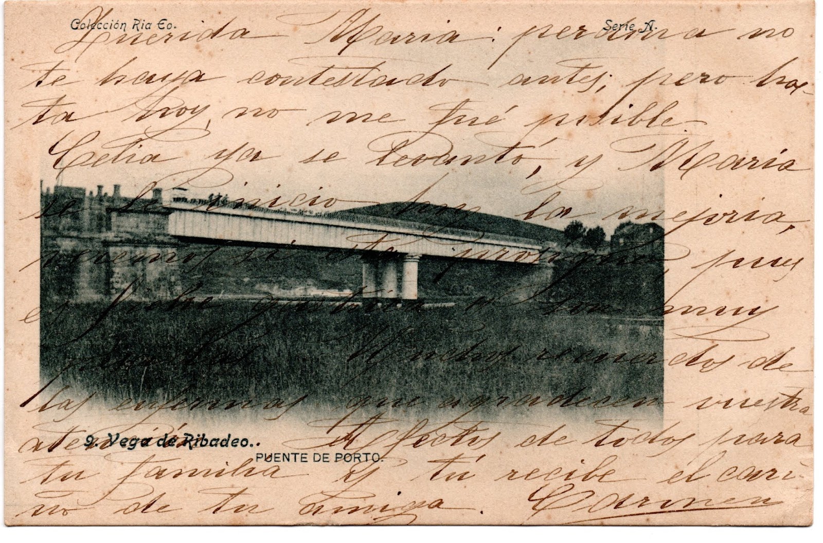 Aunque esta tarjeta postal es casi igual alas dos anteriores pertenece a otra edición, la caligrafía utilizada en la impresión es diferente, el matasellos es de Rivadeo del 19 de diciembre de 1906 y va dirigida a la señorita María (Fernández de la) Vega a Vega de Ribadeo, cuando María ya tendría unos 15 años.